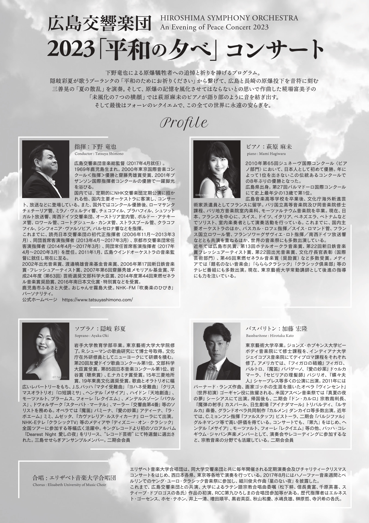 下野竜也による原爆犠牲者への追悼と祈りを捧げるプログラム。隠岐彩夏が歌うプーランクの「平和のためにお祈りください」から繋げて、広島と長崎の原爆投下を音符に刻む三善晃の「夏の散乱」を演奏。そして、原爆の記憶を風化させてはならないとの思いで作曲した糀場富美子の「未風化の7つの横顔」では萩原麻未のピアノが語り部のように音を紡ぎ出す。そして最後はフォーレのレクイエムで、全世界に永遠の安らぎを求めて音を重ねます。
