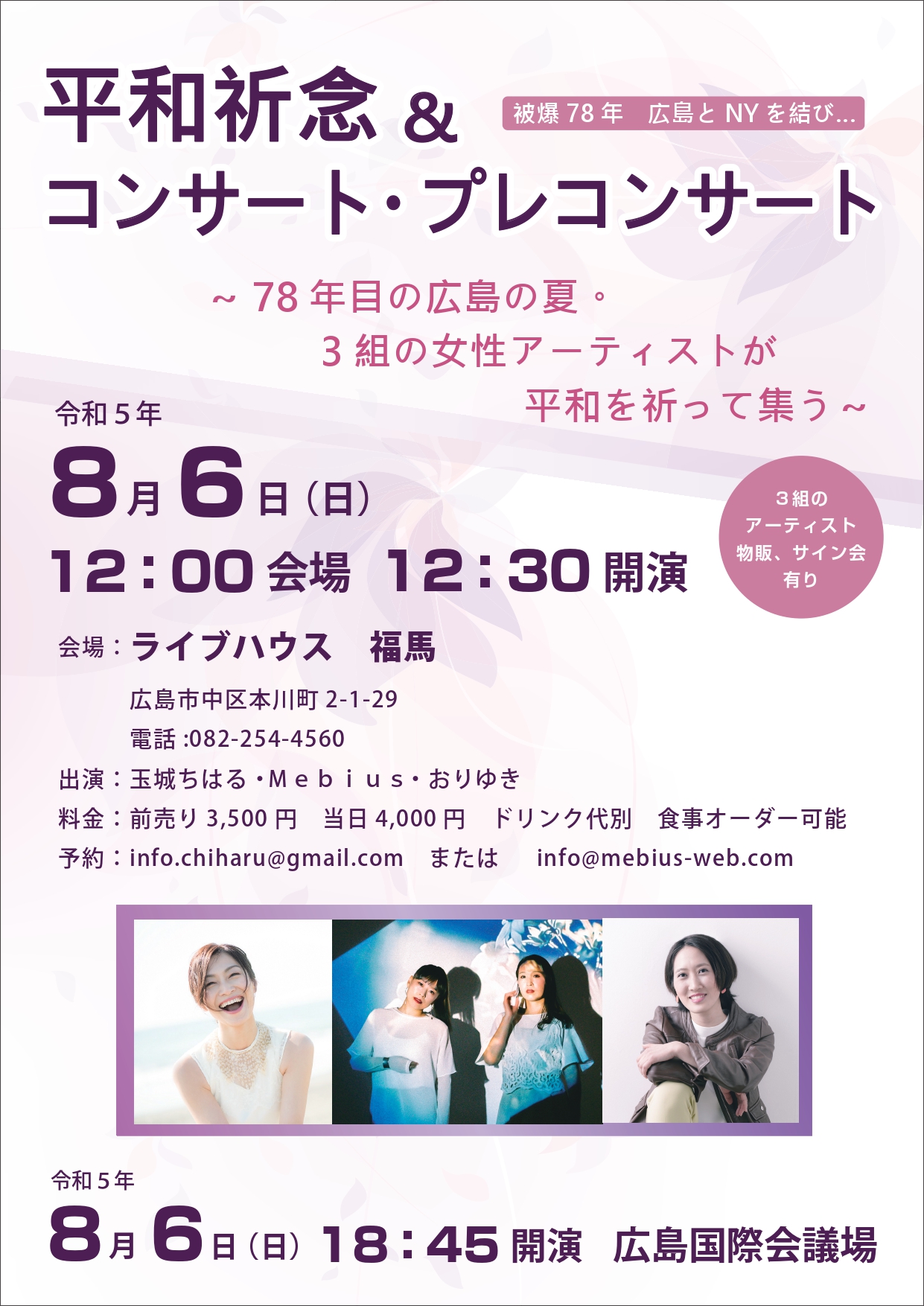 8月6日(日)18:45国際会議場での平和祈念&コンサートに先駆けた、その夜公演に出演の3組「玉城ちはる」「Mebius」「おりゆき」によるプレコンサートです。夜公演より昼公演の方が、たっぷり出演時間があります。