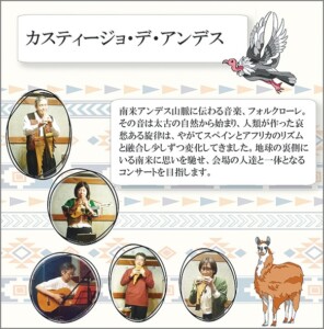 南米アンデス山脈に伝わる音楽、フォルクローレ。その音は太古の自然から始まり、人類が作った哀愁ある旋律は、スペインとアフリカのリズムと融合し少しずつ変化してきました。アンデスに思いを馳せ会場が一体となるコンサートをお届けします。