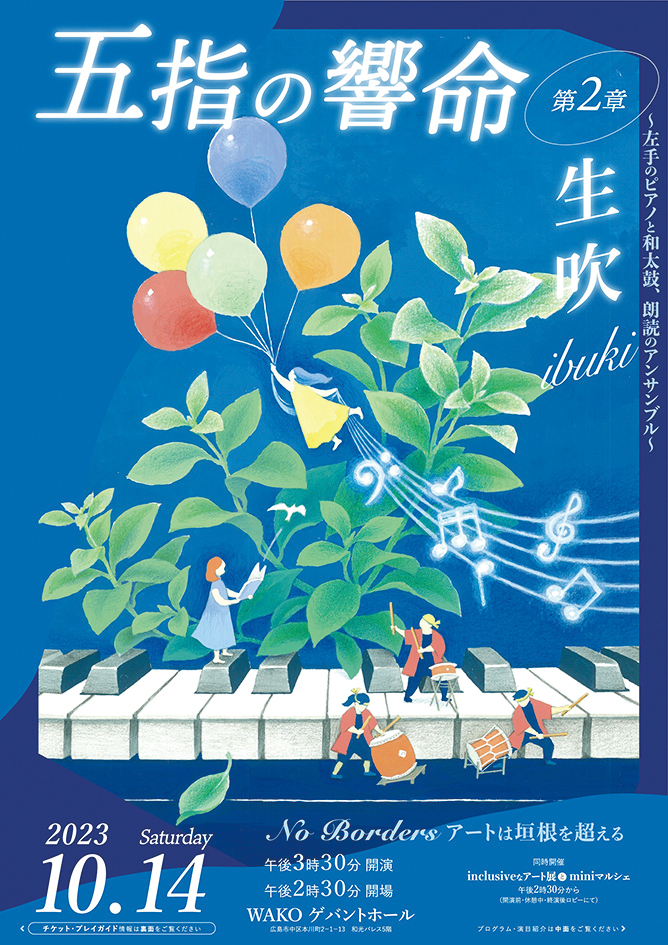 病を乗り越え、左手ピアノで数々の交響楽団と共演してきた瀬川泰代さんが、さまざまなアーティストとコラボレーションするシリーズ。今回は和太鼓や朗読がピアノとコラボする。ゲストには、中途失聴・難聴者たちによる和太鼓グループ「天手鼓舞」と、京都を拠点に活躍中の朗読家・馬場精子さんを招く。開演前や終演後にはアート展やマルシェもあり。