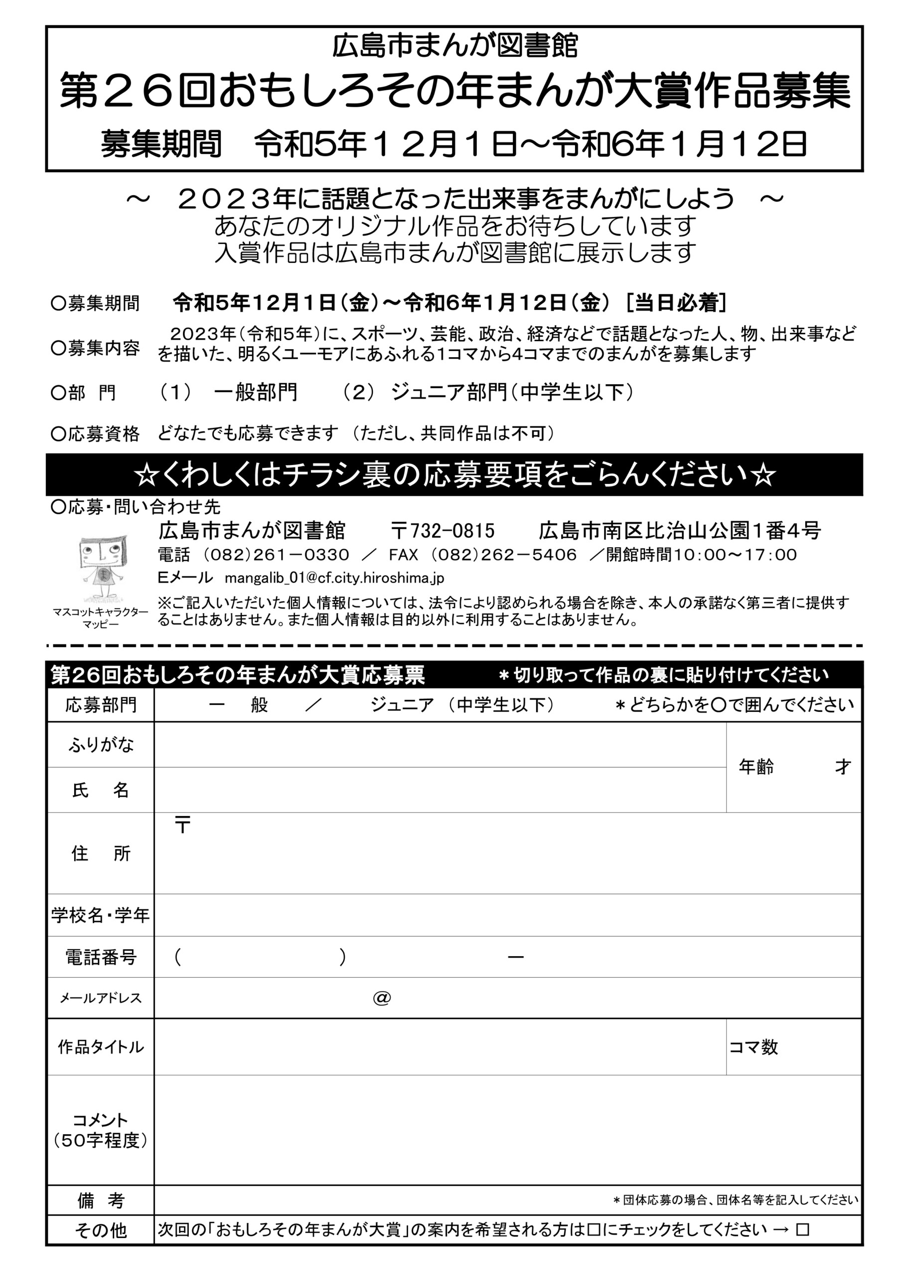 ※応募方法の詳細は、広島市まんが図書館ホームページまたはチラシで。