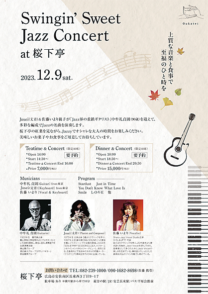 Josei(丈青)&佐藤いより親子がJazz界の重鎮ギタリスト中牟礼貞則(90歳)を迎えて、多彩な編成でJazzの名曲を演奏します。桜下亭の紅葉を見ながら、美味しいお菓子やお食事と共にJazzyでオシャレな大人の時間をお楽しみください。【要予約】