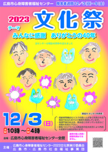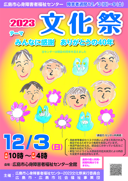 「みんなに感謝 ありがとうの40年」をテーマに、センターを利用する皆さんの日頃の成果を発表します。ステージ、作品展示、クイズラリー、お楽しみ抽選会、体験コーナー(点字、手話等)、バザーのほか、特別出演として坂マンドリンクラブの演奏やカープ選手との集い(予定)も! 皆さんのお越しをお待ちしています。