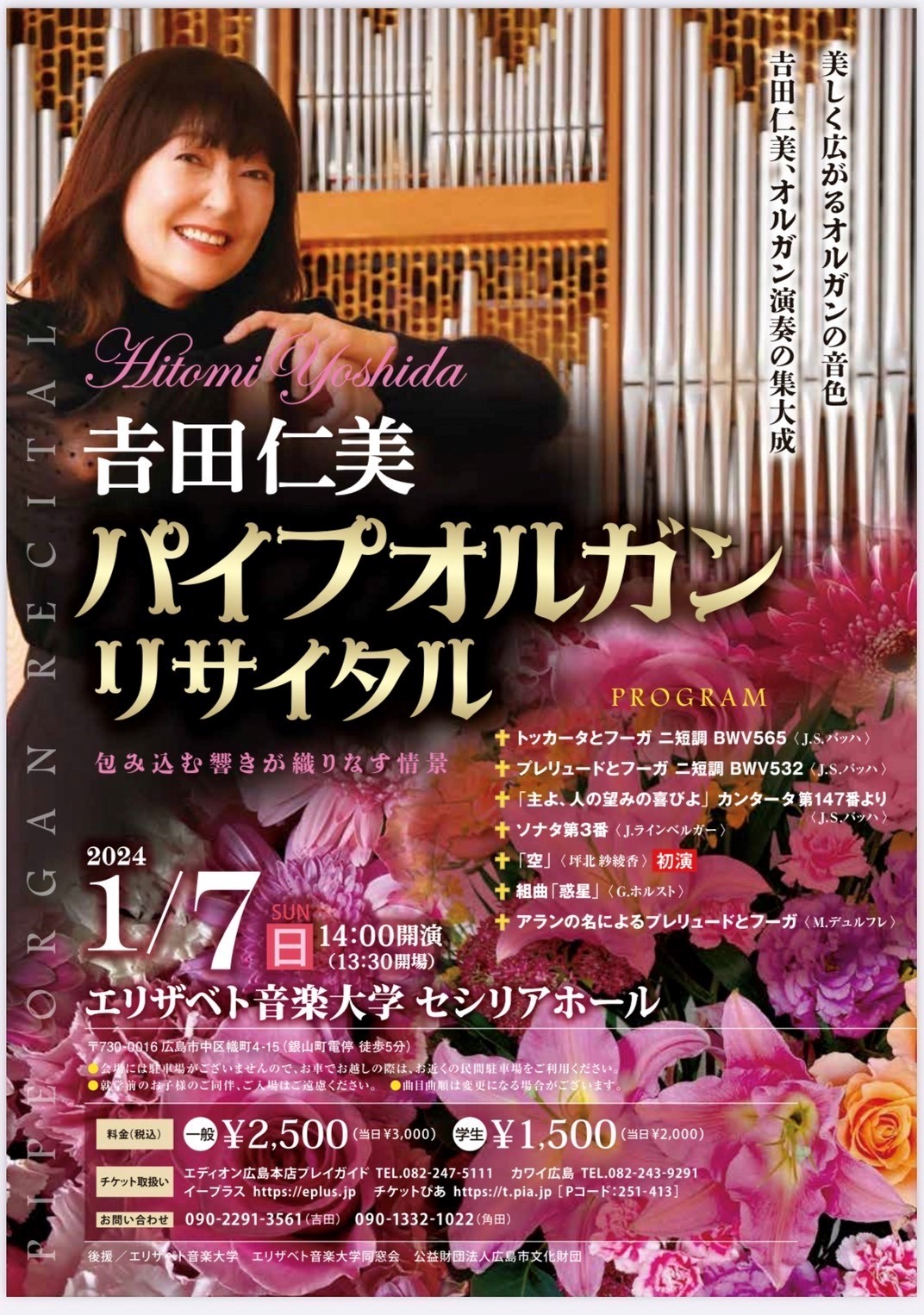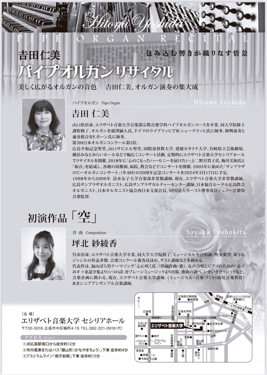 2,740本のパイプから成る日本屈指のパイプオルガンで、𠮷田仁美が迫力のある演奏をお届けします。曲目はバッハの名曲「トッカータとフーガ ニ短調」「主よ、人の望みの喜びよ」など4曲と、よくオーケストラで演奏されるホルストの「惑星」をパイプオルガンで演奏します。坪北紗綾香さん作曲の「空」は初演です。