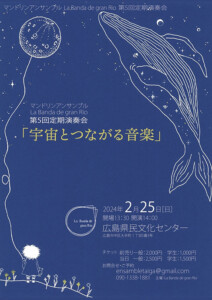 マンドリニスト佐古季暢子主宰のマンドリンアンサンブル。今回のテーマは「宇宙とつながる音楽」。夜空に浮かぶ月や星を楽しむように、音で紡ぐ天体をお楽しみください。