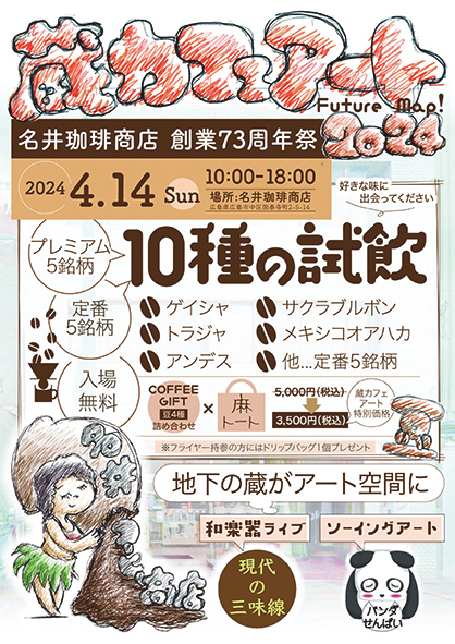 地下の蔵がアート空間になります。イラストレーター・パンダせんぱい、現代の三味線をはじめとする地元アーティストを迎え、ソーイングアート展示、三味線・箏・尺八の生演奏、店舗ではゲイシャコーヒー等の驚きの味わい全10種類の無料試飲会、麻トート入り豆ギフトセットを、イベントだけの特別価格で販売します。
