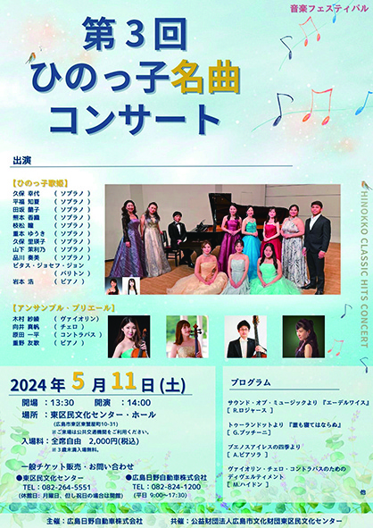 昨年に引き続き「ひのっ子歌姫」による演奏とヴァイオリニスト木村紗綾主宰の「アンサンブル・プリエール」が名曲の数々をお届けします。