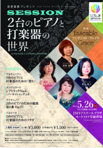 京都市立芸術大学の同期4人によるコンサート。パーカッションは荻原里香さん、関谷康子さん。ピアノは武田佳美さん、福井真裕子さん。それぞれ各地でオーケストラなどを経験し、現在は講師や客演奏者として活躍中。プログラムはラフマニノフ「2台のピアノのための組曲」や、バルトーク「2 台のピアノと打楽器のためのソナタ」など。4 人の持ち味を発揮した4 曲を楽しめる。