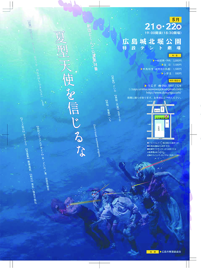 テントを抱え、全国各地を旅して回る「劇団どくんご」。公園、駐車場、神社、空き地などが劇場に大変身。楽器や身体言語などを用いて、どんな人も楽しく観覧できる。広島ではさまざまな店舗や個人が協賛して公演が実現。「テント内に生まれる一期一会の一体感が魅力。気持ちが明るくなれるはず」と実行委員。長年続いた旅公演は2024 年で最後。見逃さないで。