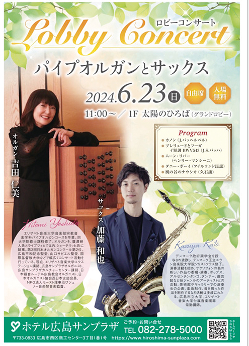 年に4 回開催される広島サンプラザのロビーコンサート。オルガニストの吉田仁美さんとゲストによる心を込めたプログラムで、毎回さまざまな楽器との共演が楽しめます。