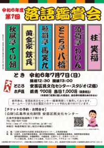 広島演芸協会のメンバー、柱笑福、葡萄亭わいん、ところ亭八橋、鯨韻亭馬笑九、黄金家鉄兵、秋風亭てい朝の6名による『落語鑑賞会』笑って泣ける人情の世界をご堪能ください。