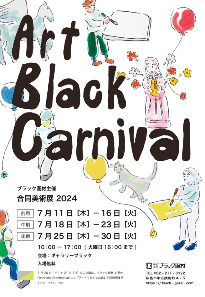 鉄砲町の画材店&ギャラリーによる企画展。作品のジャンルは、絵画、立体、書道、水墨、生け花、など何でもあり。出展グループごとにブースが用意され、来場者はブースごとに見て回れる。出展グループは前・中・後期の会期ごとに総入れ替え。多彩な創作に刺激を受けて。7月20日(土)と21日(日)の2日間は、同会場4 階で「アートマルシェ広島」も開催。
