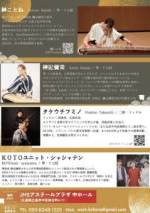 広島県内外で箏の演奏活動をしている榊ことねが、沢井箏曲院 教師の昇格記念として箏リサイタルを開催します。ゲストに榊記彌栄(箏・十七絃)、タケウチフミノ(二胡・フィドル)を迎え、KOTOユニット・シャシャテン(箏・十七絃)も賛助出演。