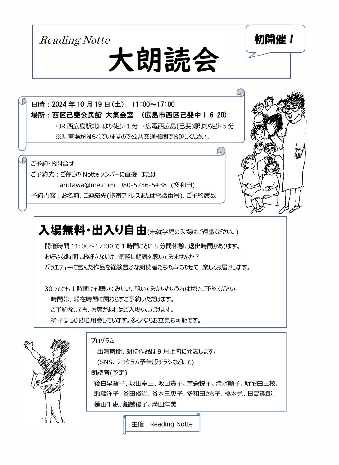 結成16年目のReading Notteが初めて開催する長時間の大朗読会。入場無料、出入り自由。15人のメンバーそれぞれがチョイスした作品をお楽しみください。本格的朗読を気軽に、お好きなだけどうぞ。