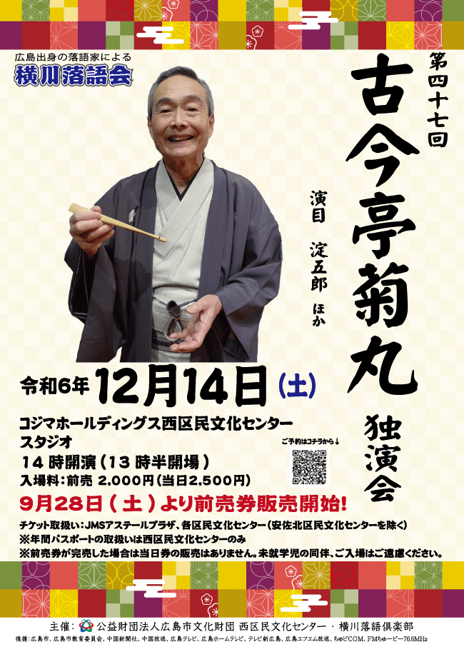 広島出身の真打落語家による独演会シリーズ。第47回は呉市出身の古今亭菊丸さんによる独演会です。円熟した話芸をじっくりお楽しみください。
