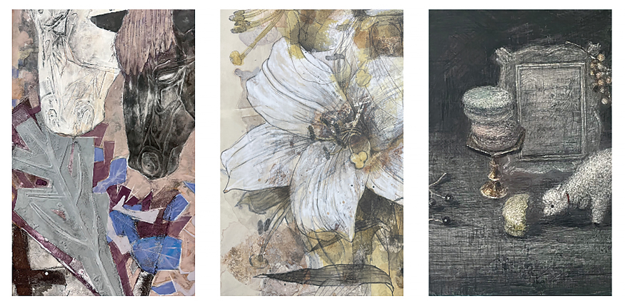 - (左)水越千紘「闘わない馬」(部分) (中)田村美智子「久遠の花」 (右)明智幸「オヤツの時間」(部分)
