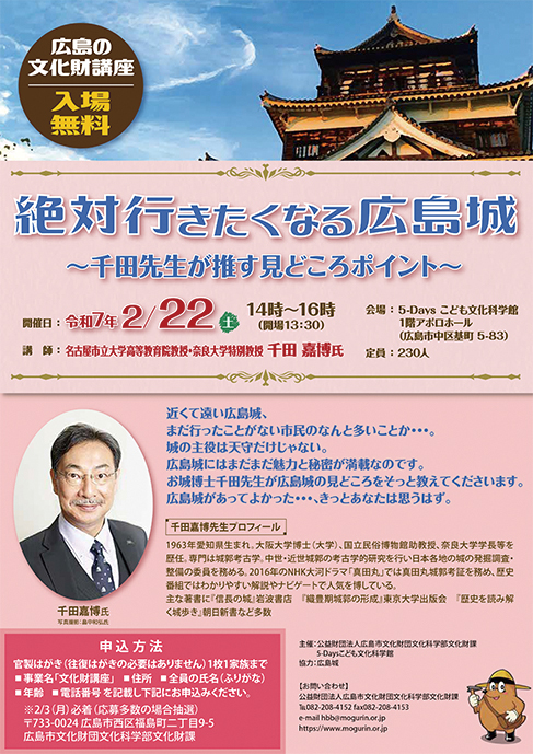 事業名「文化財講座」・住所・参加者全員の氏名(ふりがな)・年齢・電話番号を記載し、〒733-0024 西区福島町二丁目9-5 広島市文化財団文化科学部文化財課へ。※2月3日(月)(必着)