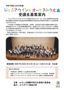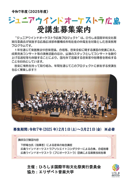 “ジュニアウインドオーケストラ広島プロジェクト”は、ひろしま国際平和文化祭実行委員会が実施する広島広域都市圏構成市町在住の中高生を対象とした音楽教育プログラムです。