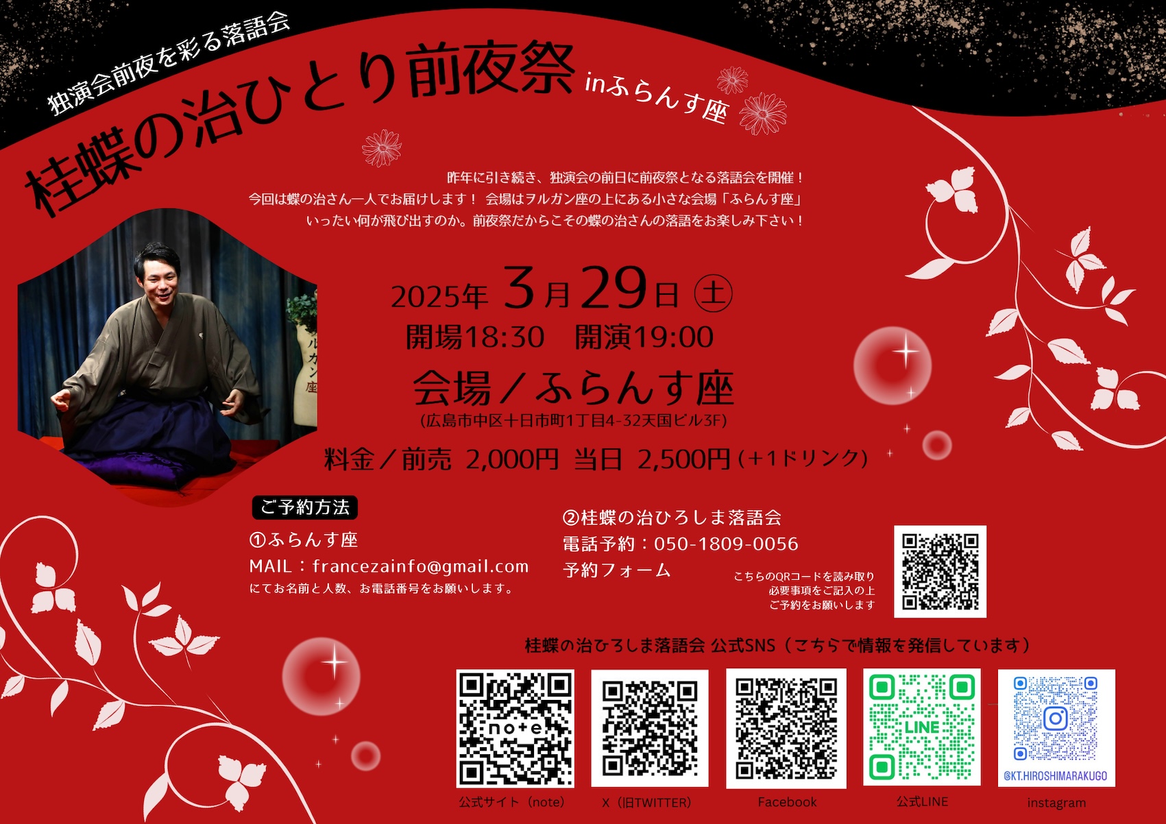 いったい何が飛び出すのか。前夜祭だからこその蝶の治さんの落語をお楽しみ下さい!