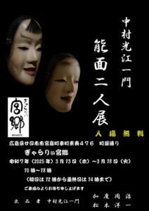 中村光江の弟子加度周治(広島県)松本洋一(兵庫県)二人による能面展を宮島町のぎゃらりい宮郷で開催します。