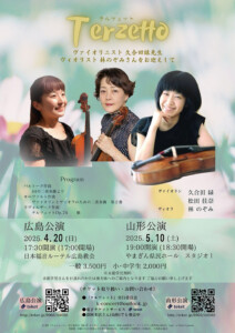 テルツェットは、イタリア語で「三重奏」の意味。広島出身で現在は山形市で暮らす、ヴァイオリニスト松田佳奈さんが、恩師の久合田緑さん(ヴァイオリン)、尊敬する林のぞみさん(ヴィオラ)を迎えるコンサートを企画した。モーツァルトやドヴォルザークの二重奏や三重奏を予定。クラシックコンサートが初めての人も歓迎。解説やトークなどで温かい雰囲気を目指す。