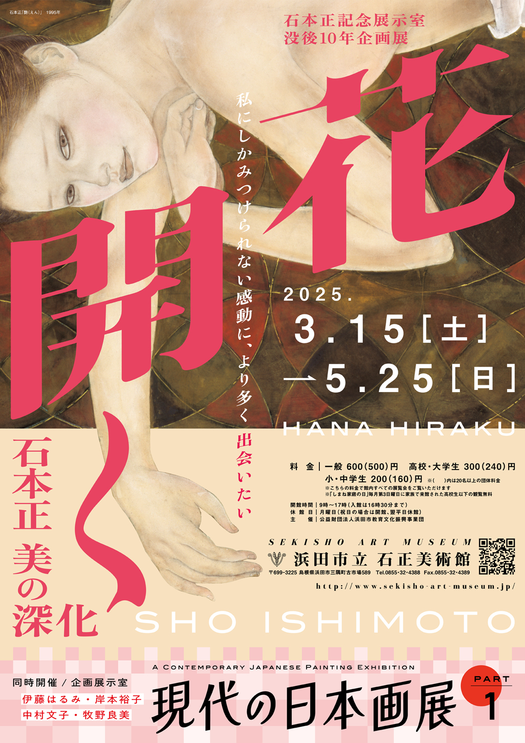 1971年、50歳の時に「第21回芸術選奨文部大臣賞」と「第3回日本芸術大賞」を受賞した石本正。本展では、1971年の受賞を機に、美に邁進する決意を新たにした石本が、自己の芸術を深化させ花開いていった50代から晩年までの花や女性像などを展覧します。