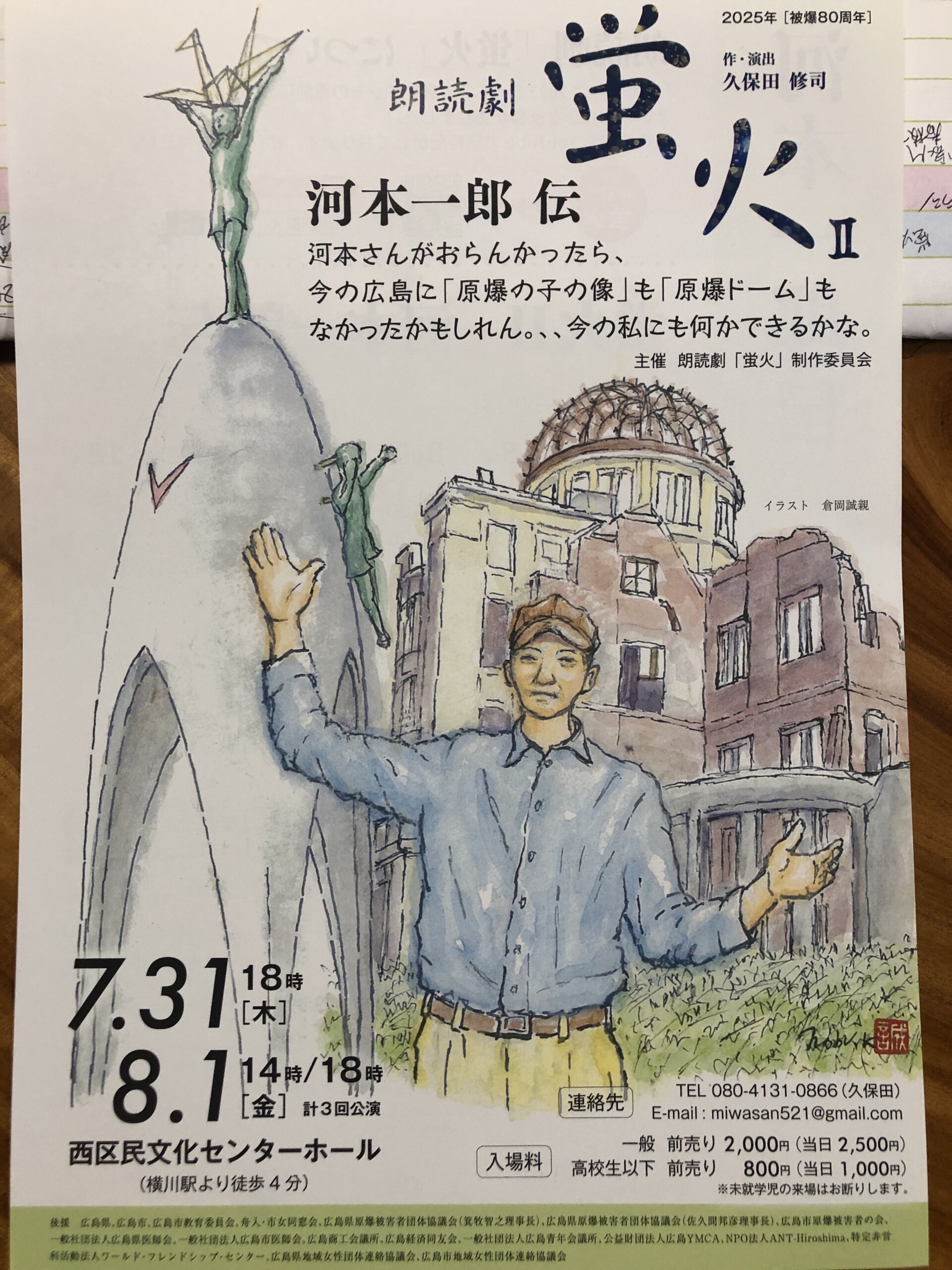 被爆80年にあたり、9歳から81歳まで120名を超える市民:小学生・中学生・高校生・大学生・社会人(被爆四世の小学5年生や80代の被爆者もおられます)が、「核兵器のない平和な世界」の実現を願い、広く世界に訴えるため、朗読・合唱・音楽・挿絵・衣装・ダンス・制作など様々な形で、プロ・アマの垣根を超えて参加・上演する市民創作劇。