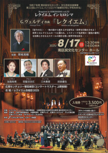 レクイエム合唱団2025が広島センチュリー管弦楽団と4 人のソリストを迎え、世界3 大レクイエムの一つG.ヴェルディ作曲「レクイエム」を歌い、世界平和を祈るコンサート。
