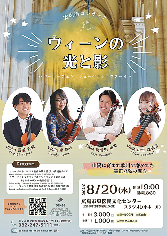 ヴァイオリン奏者の東珠子さん、長瀬大観さん、ヴィオラの山本絵里奈さん、チェロの阿曽沼裕司さん。現在はベルギー、フランス、日本で活躍する4 人によるコンサート。「ウィーン」をテーマに、三重奏や四重奏を届ける。ウィーン黄金期を代表するシューベルトやベートーヴェン。その後、困難な時代を生きたコダーイ。ヨーロッパの深層を、3 つの曲で表現する。