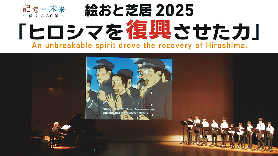 ヒロシマの体験を「絵おと芝居」で伝える。絵おと芝居とは、広島の作家・いくまさ鉄平さんが2014年に始めた紙芝居×朗読劇×生演奏。2024 年からは広島ホームテレビも加わり、アナウンサーが朗読で参加。地元の中高生にも呼びかけ、大きなプロジェクトになっている。今年の集大成となる公演は11月23日(日・祝)。10 月は安田女子大生による英語公演を含む2 作上演。