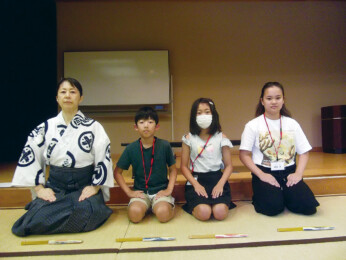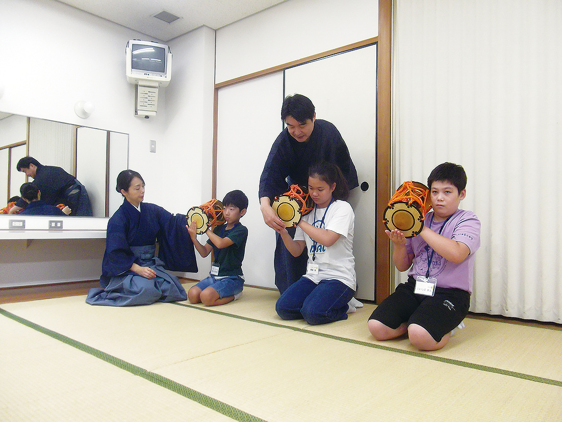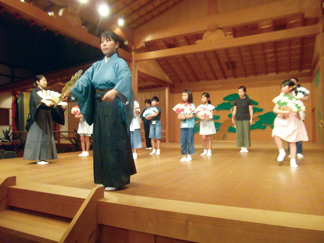 「深く息を吸い、遠くに向かって声を届けるイメージで」との指導で、こどもたちは能「高砂」の一節を謡った。低学年には難解な内容だが、この日本古来の発声法は能楽が後世に伝承する大切な使命を果たしているように思えた。