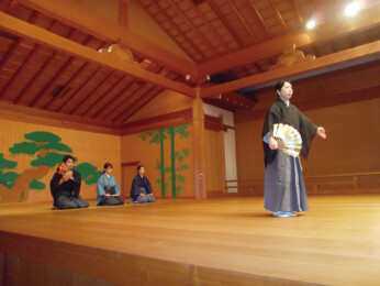 講師は能楽シテ方(シテとは能の主役)の大島衣恵先生で、能舞台の説明から始まった。能を舞う本舞台の左手に登場人物の通路がある。この橋のような部分は「橋掛」との名称で、何と「あの世」と「現世」を繋ぐものとの説明に俄然興味が湧いてきた。橋掛かりから神や鬼や亡霊が本舞台に登場し、舞台後方のひな人形の五人囃子に似た「囃子」から、鼓や笛の演奏に合わせて謡い舞うイメージが講師の説明から広がっていく。