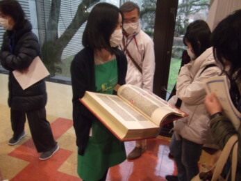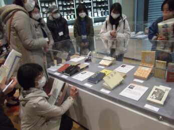 ギャラリートーク後半では「現代の装丁家たち」のテーマで、日本を代表するブックデザイナーの菊地信義氏らの手掛けた本が、作品として展示されていた。これらの作品を見ながら「本の見方が変わりますね。これからは本の装丁も含めて作品として楽しみたいと思います」(府中町から参加の男性)との感想があった。私も同感である。企画した図書館スタッフは、努力が報われ「我が意を得たり」であろうかと思う。次回の企画展を楽しみに待ちたい。