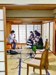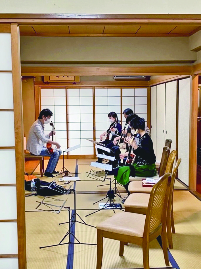 『現代の三味線』は、三味線で現代的な曲を弾いてみたい人達が、流派に関係なく週に1度集まり自主練習する会。イス、譜面台を使い、譜面は五線譜。メンバーは、学生時代のクラブ活動経験者、中高年で初めて三味線を手にした人、洋楽器と並行して楽しむ人など年齢・経験もさまざま。上達を目指したい人は「野澤徹也三味線合奏団広島支部」のメンバーとして、月に1度、野澤先生のレッスンを受けることが可能です。