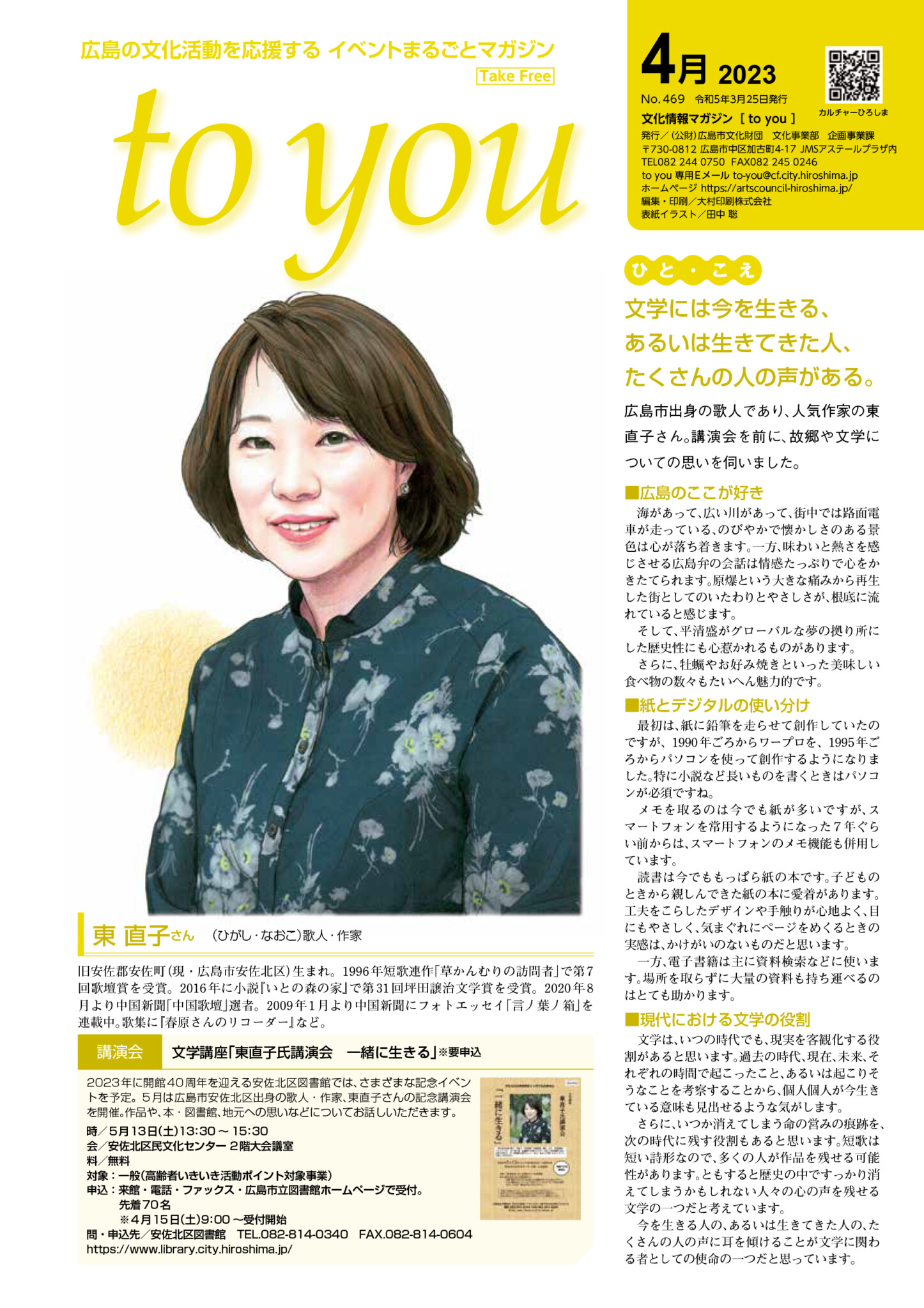 「to you」は、広島の文化向上発展に大変役立っていると思います。芸術鑑賞が好きな私には、とても重要なマガジンです。もう、この3月で468号となるのですね。発行当時から、カバンに入れてチェックするのが楽しみです。写真や記事にも新しい発見があります。web版よりも私は、このマガジンが好きです。ページをめくりながら、明日の文化散歩をどうしようかと楽しんでいます。(中区 舟入のかっちゃんさん)