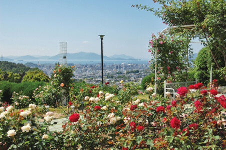 高台のバラ園からは、世界遺産の島「宮島」を一望できます。週末の日中(10時〜 12時、13時〜 15時)は、バラ園まで電動カートを定期運行していますので、ぜひお立ち寄りください。
