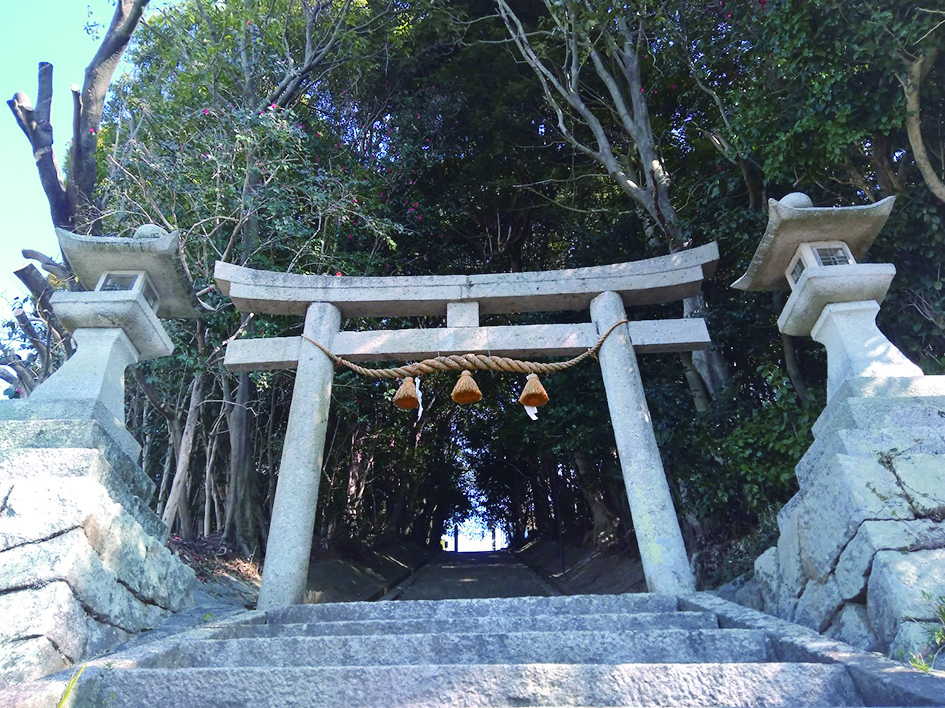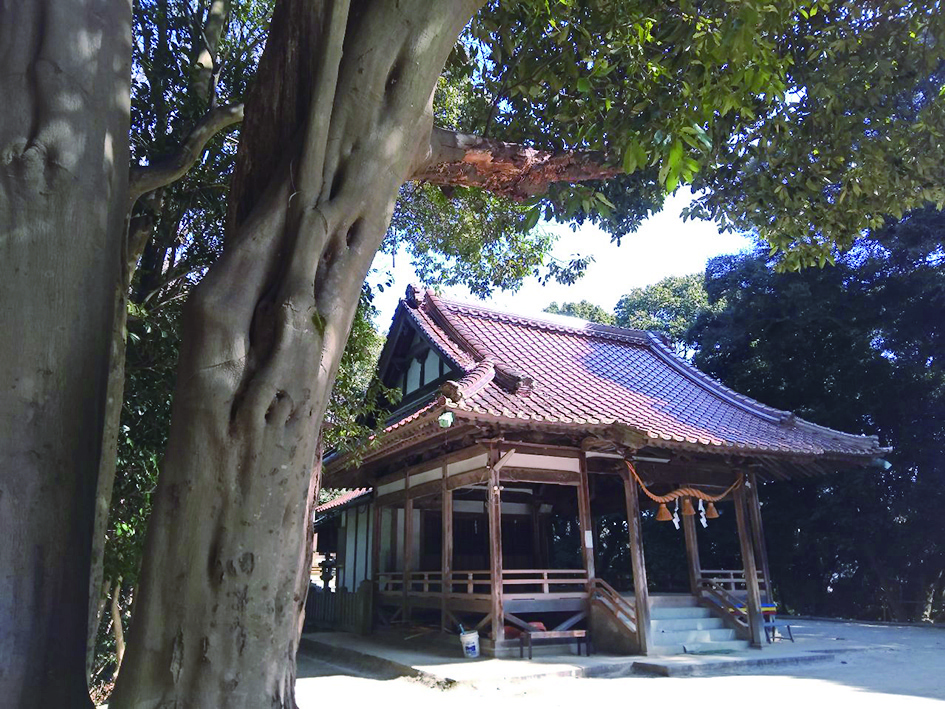 社叢(社殿や神社境内を囲うように密生している林)は、この地方の自然林の原型をよく保っていると言われています。全体的にシイが生え、高木にアベマキ、コナラ、ツガ、シイモチ、アラカシが、低木にヤブツバキ、ネズミモチ、リンボクなどが見られます。地面の近くには、ジュズネノキ、シロダモ、ベニシダが生えています。