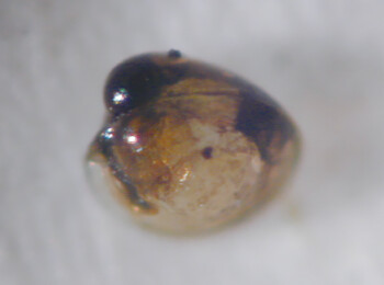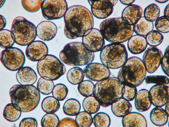 ①幼生の出現調査:網目のとても小さなプランクトンネットを使い、約200ℓの海水中にいる生物を採集。そこからカキ幼生だけを見極め、顕微鏡で0.09㎜から0.33㎜のサイズで9区分の大きさに分け・計数。