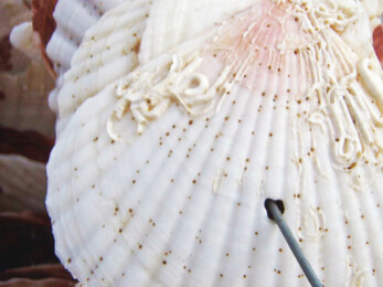 十数地点に及ぶこれらの調査結果をカキ採苗調査として取りまとめ、広島県内のカキ生産者に情報提供しています。カキ生産者は、この調査結果や気象条件、潮流等を考慮しながら、タイミングを見極めてそれぞれの漁場の海中にホタテガイの貝殻を投入していきます。カキ生産者によって異なりますが、貝殻1枚に100~200個のカキ稚貝の付着を目指し、採苗を繰り返します。