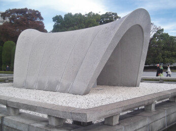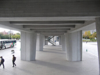 資料館1Fのピロティ(空間)の先には、直線上に慰霊碑があり、ハニワ型慰霊碑の空間からは原爆ドームが直視できる。この丹下健三氏設計の平和記念公園景観軸は、慰霊の場に相応しい配慮がある。