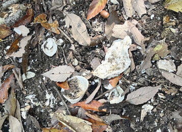 西山貝塚はおよそ1,800年前の弥生時代後期の遺跡です。牛田山(通称:西山)山頂(標高261m)から東側に少し降りたところにあり、そばには看板もたっています。ここから、カキやハマグリなどの貝殻だけでなく、動物の骨や土器、石器、鉄、青銅の金属器などさまざまなものが出土しており、その近くには竪穴住居の跡もありました。現在も、地面に当時の貝殻が散らばっています。