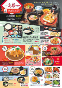 レストラン高楼は麺類などの軽食からボリュームたっぷりの高楼御前(1,500円)までバラエティに富むメニュー。